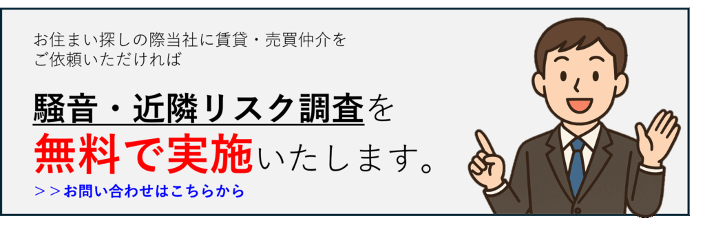 騒音問題は発生した後に対策するのではなく事前に騒音問題が発生しない、あるいは発生しにくい物件を選び、そもそも騒音問題に巻き込まれないことが重要です。つまり、事前に対象の住宅において騒音が発生するリスクがないかを評価する必要があります。