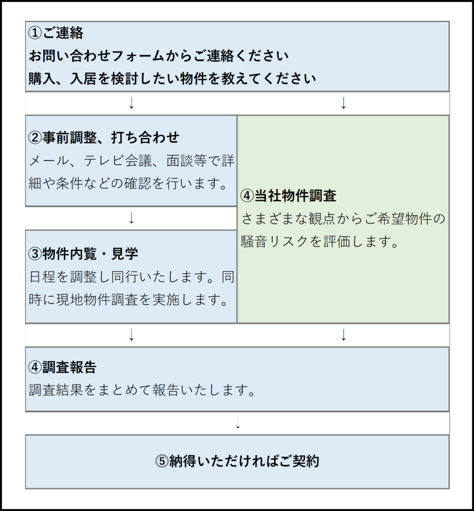 当社のマンション騒音リスク診断は、「契約前に不安を解消し、納得して物件を選ぶこと」を目的としています。ここでは、お問い合わせからご契約までの流れを分かりやすくご説明します。